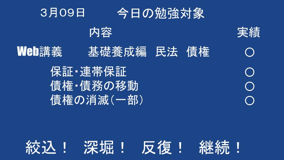 3月9日、今日は復習にも力を入れつつ、新たに学習したのは、昨日の残りの「保証債務」と「債権譲渡・債務引受」です。学べば学ぶほど、法律の世界の厳しさを痛感する一日となりました。